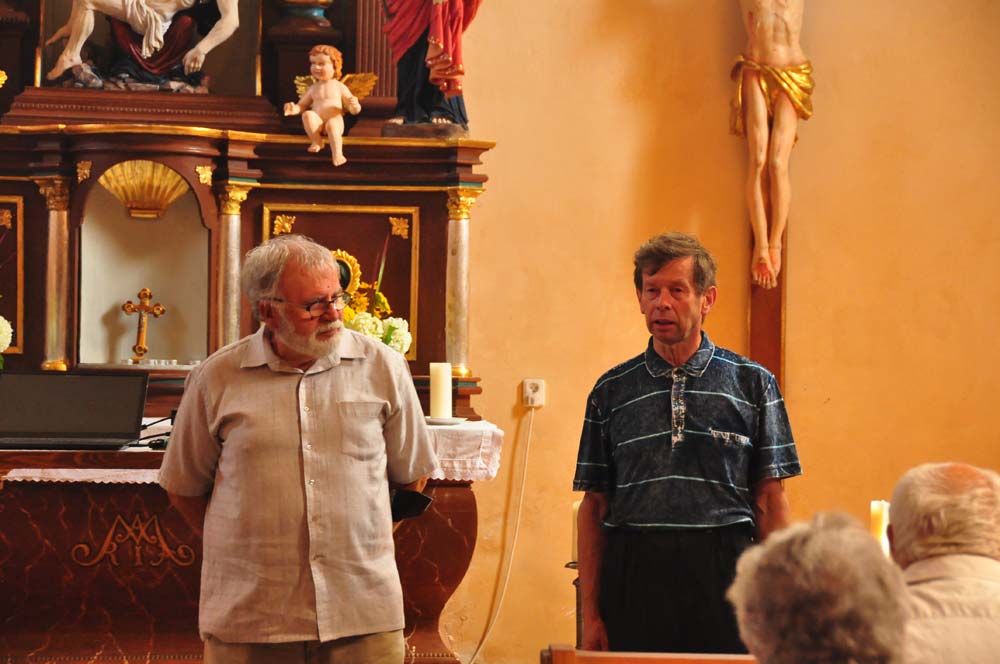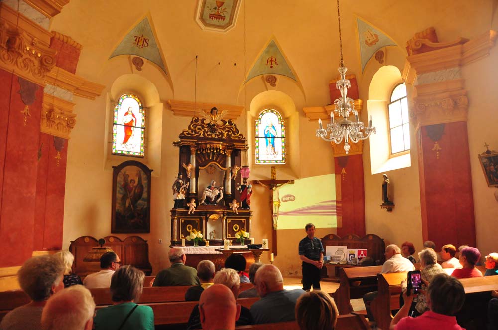 Pak jsme navštívili kapli Archanděla Michaela v obci Stráž nad Ohří. V malé kapli jsme se setkali s některými představiteli obce, kteří nám spolu s Petrem Rojíkem vyprávěli historické detaily obce Korunní (nyní část obce Stráž nad Ohří). Zvláštní pozornost věnovali knize původních obyvatel Anny Ziener a Gernota Hilbert (Pamětní kniha Korunní), kterou Petr Rojík přeložil do češtiny.
