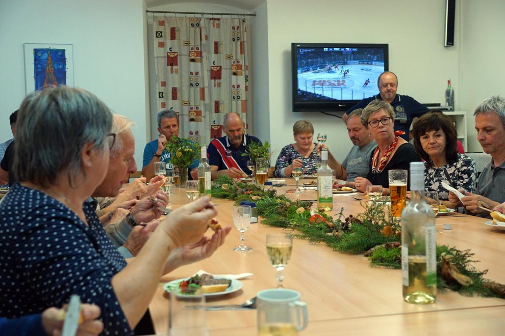 Muži byli v průběhu dne vysláni do lesa, kde nasbírali šišky, listí a další předměty pro výzdobu slavnostní tabule. Zažili tak na vlastní kůži i první letošní sníh. Odpoledne jsme pak společně s velkým zájmem shlédli dokumentární film „Krušné hory – Pohraniční příběhy Čechů a Němců mezi Kraslicemi a Klínovcem“ filmového studia SIRIUS. Vrcholem večera bylo vynikající čtyřchodové menu. Vše chutnalo skvěle a tak jsme poseděli až do pozdních nočních hodin.