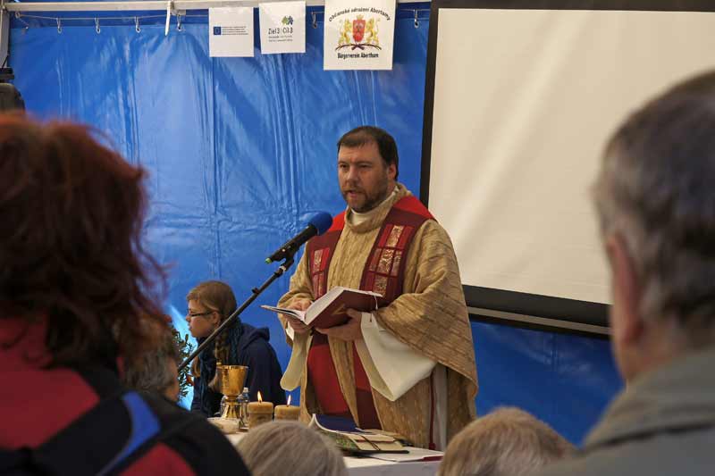 Díky spolupráce všech byly stoly a lavice rychle na místě. Jídlo a pití bylo také rychle připraveno, gril postaven. Chlebíčky, koláče, káva - vše stálo také brzičko na stolech. Krátce později - sluníčko krásně, požehnaně svítilo – si mohli první hosté vybrat a ochutnat z mnoha připravených pamlsků. Po oficiálním zahájení začla v 11 hodin Svatováclavská mše (dvoujazyčná). V poledne měli členové obou spolků plné ruce s pohoštěním četných hostů z blízka i daleka. Atmosféra byla velmi dobrá, ležerní a uvolněná, také díky krušnohorským muzikantům. Bylo dobré vidět, jak si účastníci z obou zemí rozumí. Odpoledne začla přednáška (dvoujazyčná) o hornictví v Krušných horách. Umělečtí řemeslníci z Čech i ze Saska (paličkářky, řezbáři, rukavičkáři, kameníci) vystavovali své výrobky.