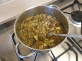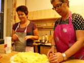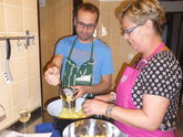 Nach dem Mittagssen begannen wir endlich, gemeinsam ein hervorragendes 4-Gänge-Menü zu zaubern. Es war eine tolle Gemeinschaftsarbeit, bestens vorbereitet von unserem Aberthamer Partnern. Aber neben Kartoffeln schälen, Fleisch klopfen, bruzeln und kochen war immer Gelegenheit für ein Späßchen oder eine nette Unterhaltung.