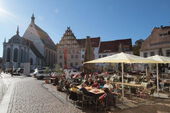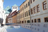 Anschließend führte uns Eva-Maria Hommel, die die Exkursion in Freiberg vorbereitet hatte, in tschechischer und deutscher Sprache an einige wichtige Gebäude der Stadt bis zum Oberen Markt mit Rathaus und schönen Bürgerhäusern.