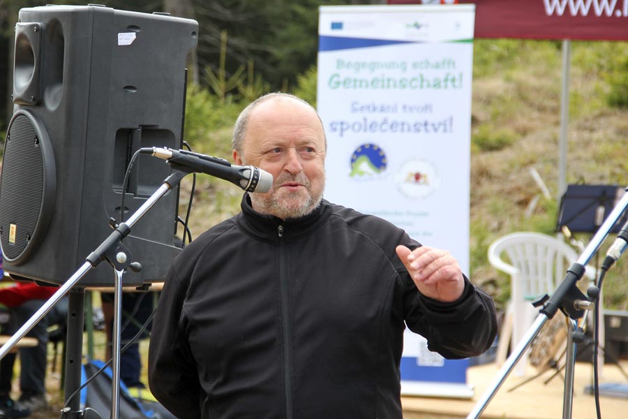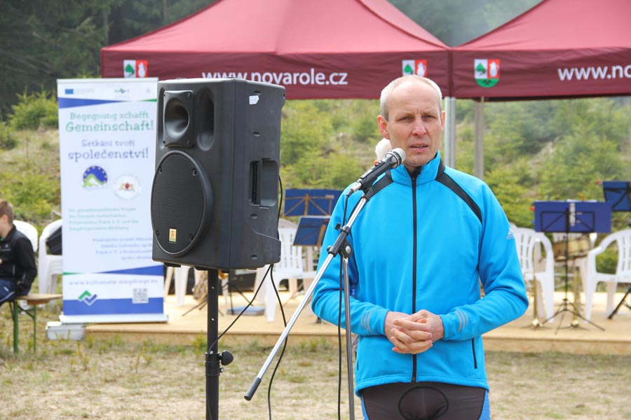 Následně bylo setkání cyklistů oficiálně zahájeno panem Hans-Uwe Haasem (Předseda německo-českého kulturního spolku Potok e. V. z obce Schneeberg) a panem Rudolfem Löfflerem (předseda Krušnohorského spolku Abertamy), kteří se svými spolky toto setkání cyklistů v rámci příhraničního projektu "Begegnung schafft Gemeinschaft" (Setkání tvoří komunitu) zorganizovali. Mimo to hosty pozdravil pan Lubomír Vítek (starosta města Nejdek) a pan Uwe Staab (starosta města Eibenstock). Jejich krátké projevy poukazovaly na význam "Karlovy stezky" i následného projektu "Karlova stezka II".