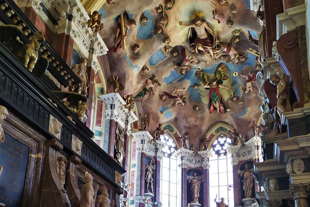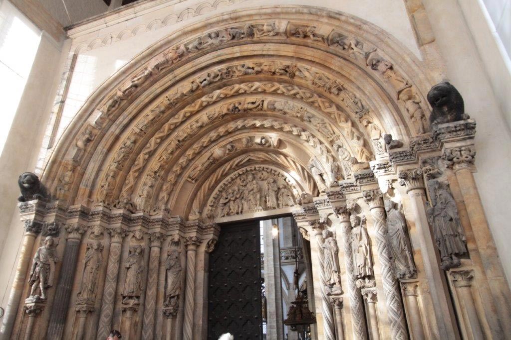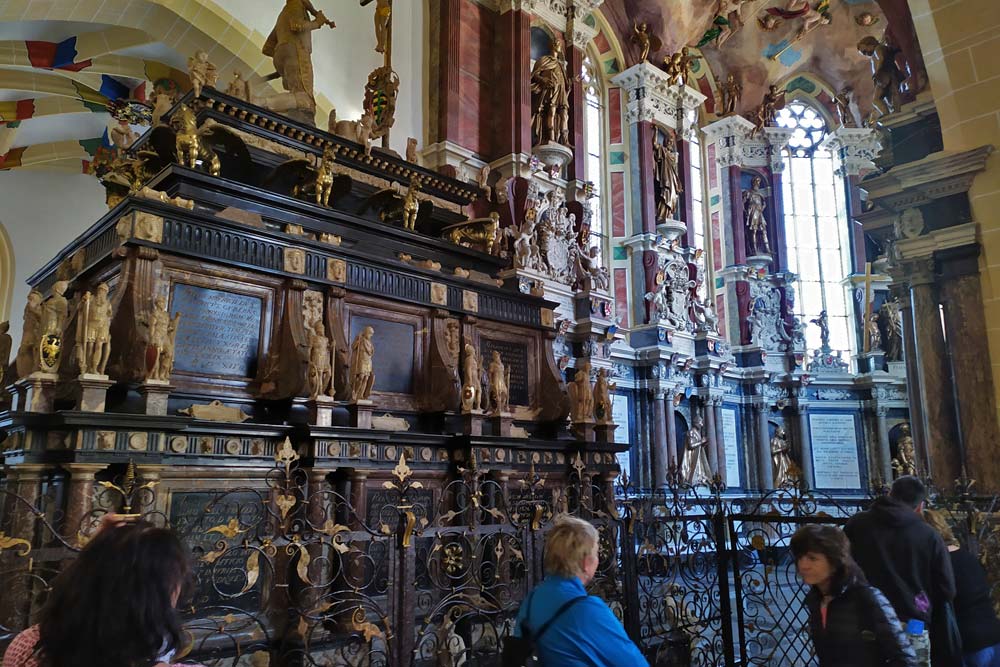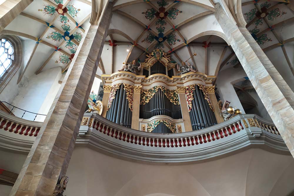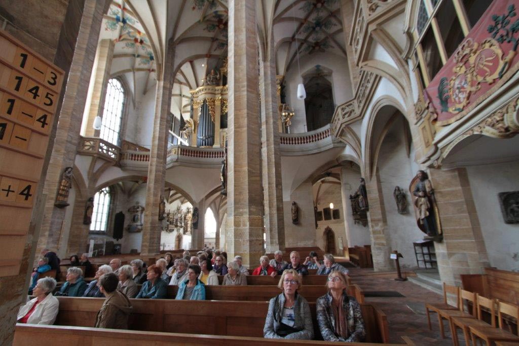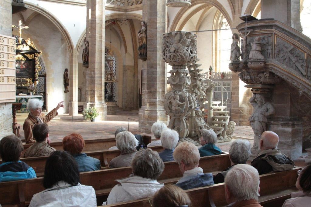 V 15.00 hodin jsme byli pozváni na prohlídku katedrály Svaté Marie. Na začátku jsme slyšeli dvě skladby na Silbermannovy varhany. Obzvlášť hudba skladatele Johanna Sebastiana Bacha zněla v katedrále nádherně. Naše průvodkyně nám ukázala nejdůležitější díla a vysvětlila jejich symboliku - kazatelny (Bergmannskanzel, Tulpenkanzel), světoznámou Zlatou bránu (Goldene Pforte), pohřební kapli a obnovenou křížovou cestu.