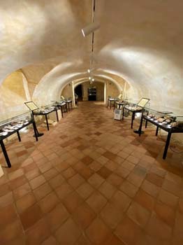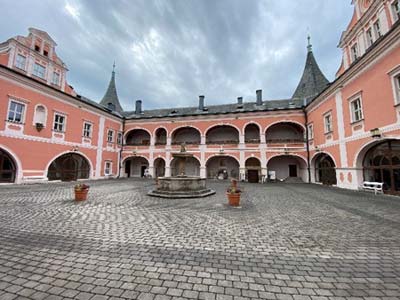 V 9 hodin nás Petr uvítal v bráně zámku. Nejprve jsme navštívili pokladnici ve sklepení zámku. Tam jsme si prohlédli cenné šperky, které byly nalezeny při restaurování zámku v roce 1993. Bohužel nám nebylo dovoleno fotografovat.