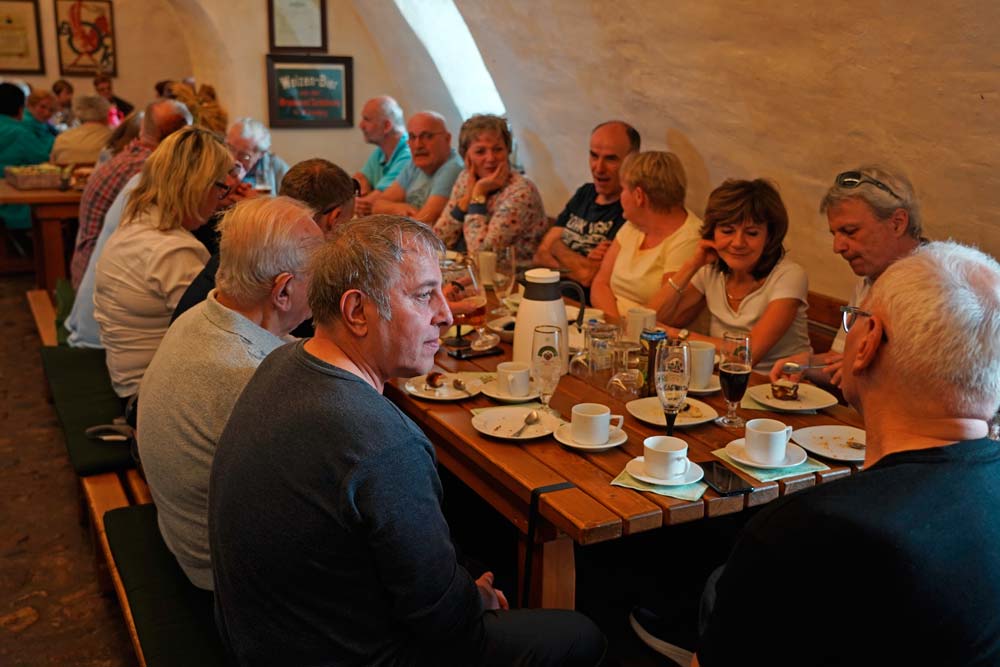 Po dlouhé cestě, zejména účastníků z Kraslic a z Klingenthalu, jsme akci zahájili posezením v zámeckém sklípku u kávy a koláče. Novinky jsme si již stačili sdělit. Poté mnozí navštívili krásnou zámeckou zahradu. Pak jsme se sešli v prostorách zámku, kde nám průvodkyně vyprávěla o historii zámku a poté nás zámkem provedla. Všichni byli nadšeni úspěchy a nasazením mistního spolku (Freundeskreis Schloss Wildenfels e.V.), kterému se zdařilo proměnit zámek opět v klenot.