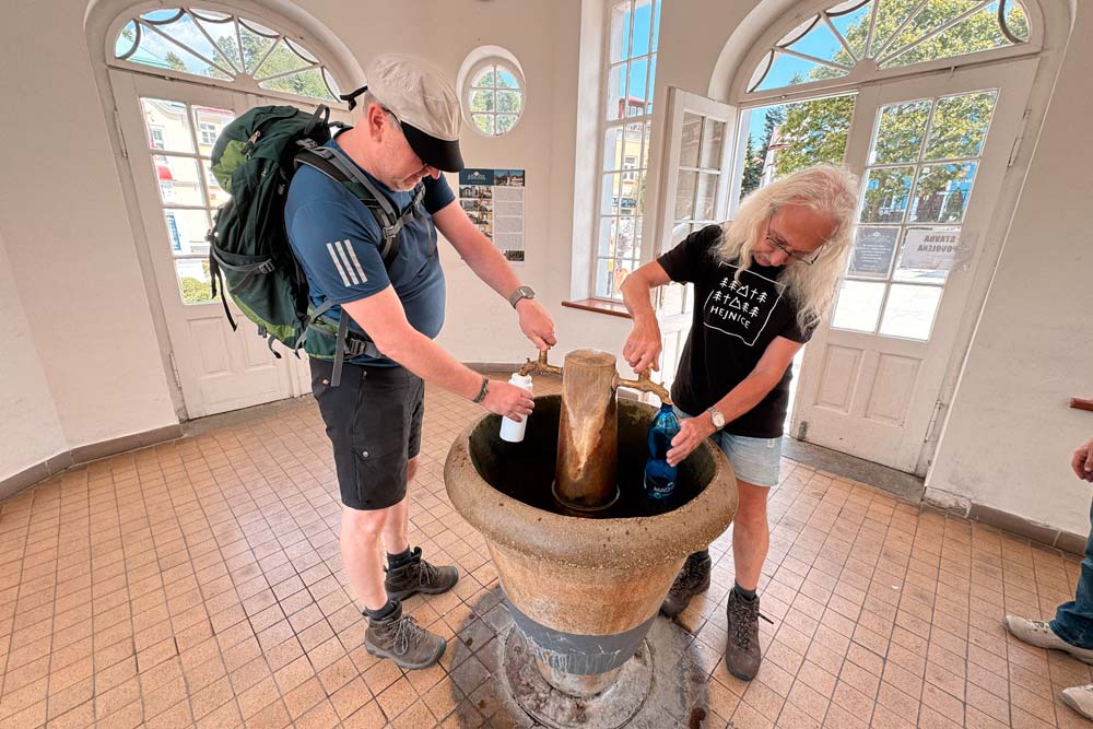 Gleich nach der Ankunft starteten wir zu einem gemütlichen Spaziergang durch Straßen, Pfade und Schleichwege über Hejnice (Heinsdorf) nach Bad Liebwerda. Hier konnten wir am Mineralbrunnen vom schmackhaften Wässerchen kosten und unsere Trinkflaschen auffüllen. Dann machten wir uns wieder auf die "Socken", durch einen kleinen idyllischen Kurpark, zu einem Besuch in einer Strumpf- und Sockenstrickerei und zum Restaurant Obří sud (Riesenfass). Von hier aus hat man eine herrliche Aussicht ins Gebirge. Nach einer Stärkung teilte sich die Gruppe. Manche nahmen den direkten Weg zur Pension. Der Rest lief über einen Waldweg zur Hubertusbaude und genoss die schöne Aussicht vom ca. 300 m unterhalb gelegenen Katzenstein (Kočičí kameny). Eine Stärkung mit Kräutern in flüssiger Form brachte uns beschwingt mit frischer Kraft über Bílý Potok und Hejnice zurück zur Pension, wo der Abend nach einer leckeren Mahlzeit ausklang.