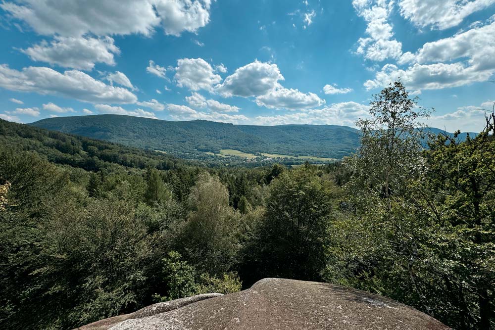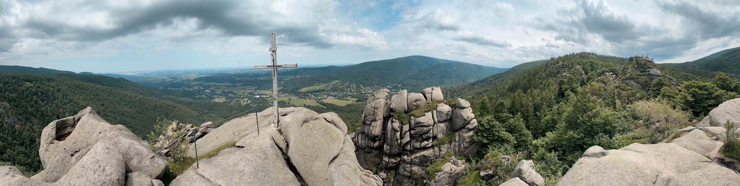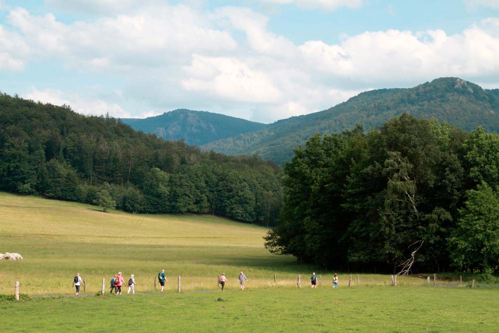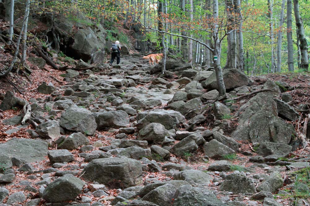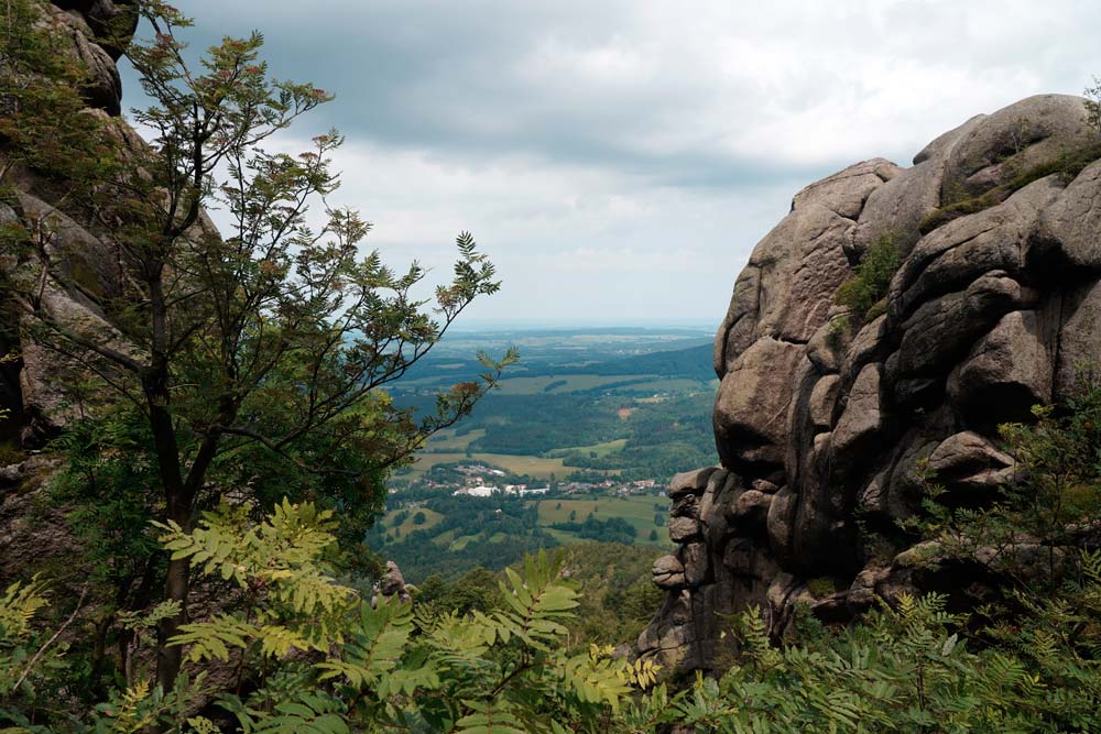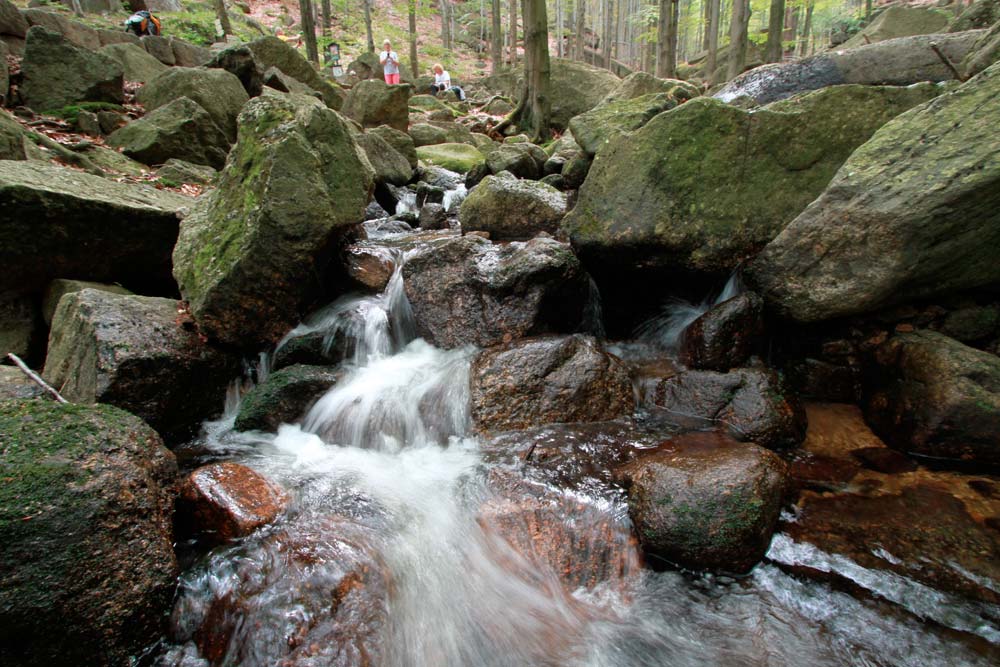 Der harte Kanten – vorbei am Campingplatz Hejnice folgten wir einem sanft ansteigenden Weg ins Schwarzwassertal bis zum Wasserfall. Von dort stiegen die "Sportlichen" einen immer steiler werdenden Weg hinauf zu den Friedländer Zinnen (Frýdlantské cimbuří – 918 m). Wer es geschafft hatte, wurde mit einer traumhaften Aussicht bis ins Zittauer Gebirge belohnt. Einmal oben, führte uns ein romantischer Gebirgspfad einige Kilometer durch Wald und Stein. Über eine ebene Forststraße und einen steil absteigenden steinigen Weg, vorbei an einem idyllischen Waldsee und dem Wasserfall gelangten wir wieder ins Tal nach Hejnice und stärkten uns im Dělnický dům für die letzten Meter zur Pension.