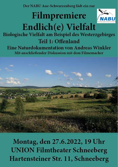 Der NABU Aue-Schwarzenberg lud am 27. Juni 2022 zur Filmpremiere der Naturdokumentation "Endlich(e) Vielfalt – Biologische Vielfalt am Beispiel des Westerzgebirges" in das Union-Filmtheater in Schneeberg ein. Der Film von Andreas Winkler beschäftigt sich mit dem Zustand von Natur und Landschaft im sächsischen und böhmischen Westerzgebirge. Neben wunderbaren Naturaufnahmen weist der Film auch auf die vielfältigen Probleme, die auch bei uns zu schmerzlichen Verlusten in der Tier- und Pflanzenwelt geführt haben. Viele bundesweit bekannte Experten kommen zu Wort bei der Analyse der Konfliktfelder zwischen Landnutzung und Erhalt von Natur und Landschaft.