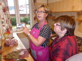 Nach dem Mittagssen begannen wir endlich, gemeinsam ein hervorragendes 4-Gänge-Menü zu zaubern. Es war eine tolle Gemeinschaftsarbeit, bestens vorbereitet von unserem Aberthamer Partnern. Aber neben Kartoffeln schälen, Fleisch klopfen, bruzeln und kochen war immer Gelegenheit für ein Späßchen oder eine nette Unterhaltung.