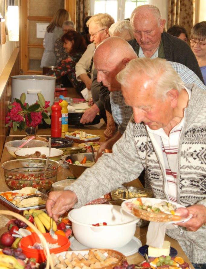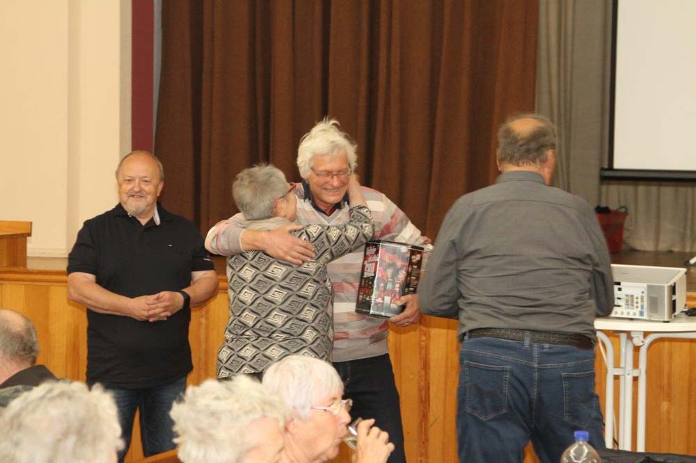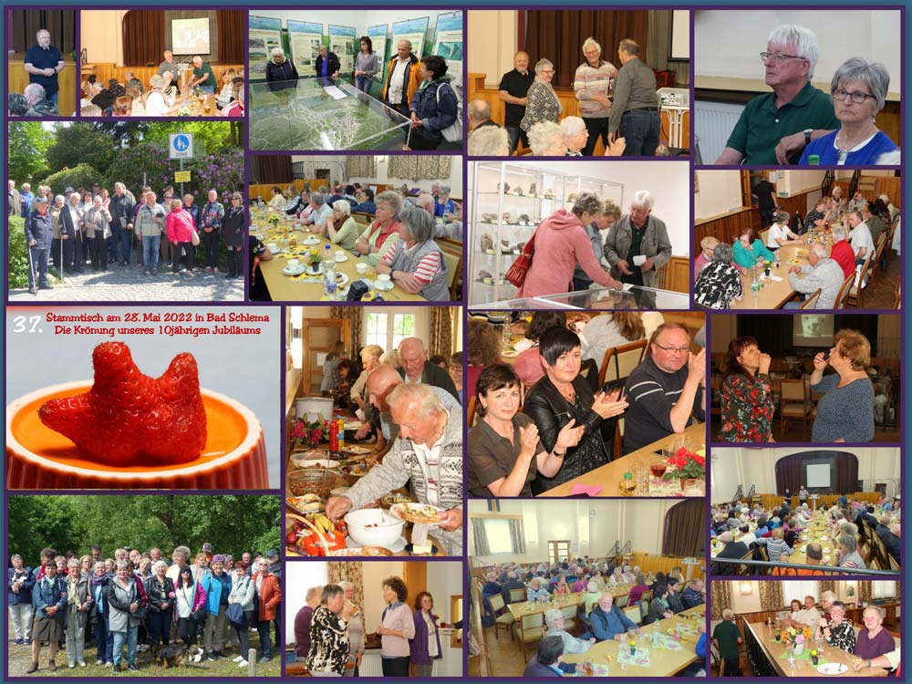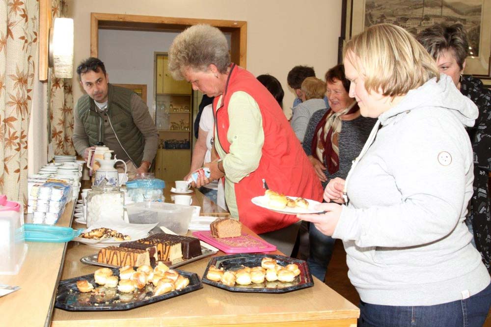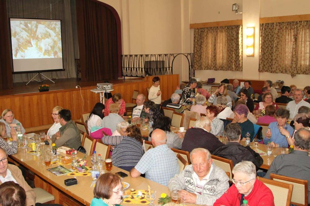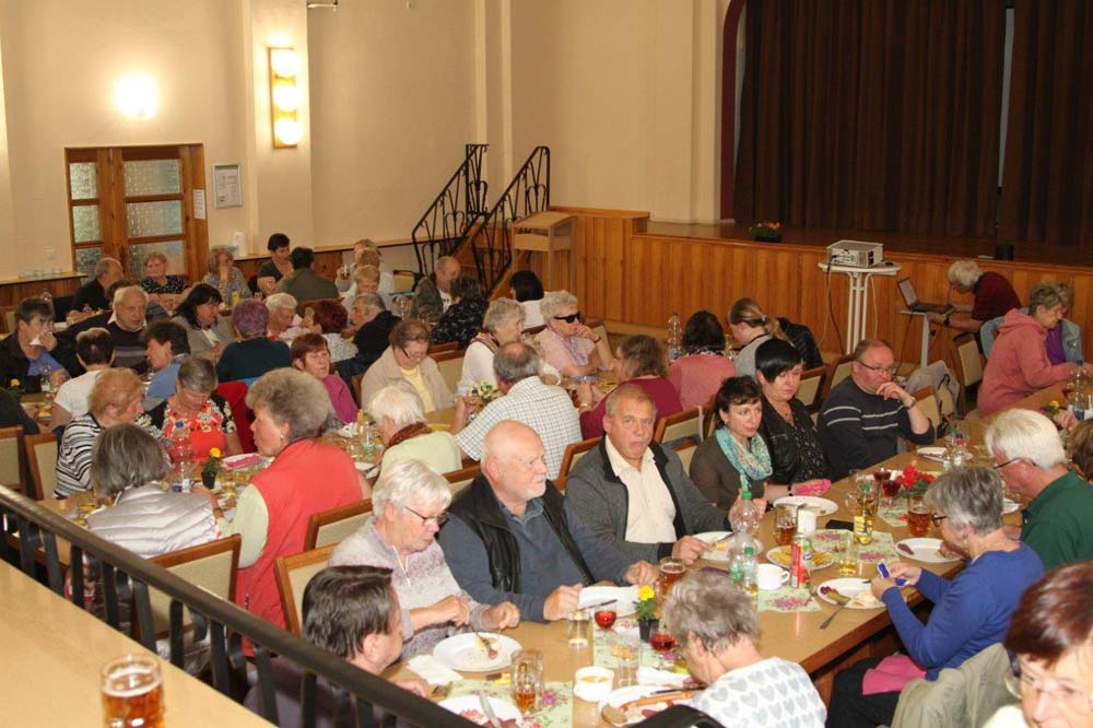 Für unser anschließendes gemütliches Beisammensein fanden wir im Schlemaer Gemeindesaal beste Voraussetzungen. Anlässlich des 10jährigen Bestehens von Potok e. V. lief eine Fotodokumentation über die Stammtische der letzten 10 Jahre und über andere Aktionen der Vereine. Diese Erinnerungen gaben oft Anlass zum Schmunzeln und waren Grundlage vieler Gespräche. Bei Kaffee und Kuchen konnte man anschließend auch noch eine Fotoshow über Bad Schlema ansehen.