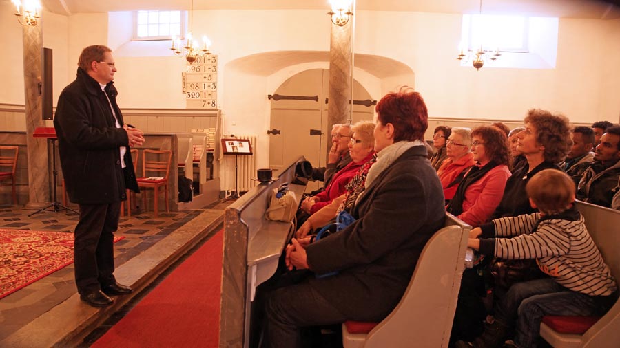 Zur Einstimmung des Abends besuchten alle die sehenswerte Kirche "Zur Ehre Gottes" in Bernsbach, wo sie den Ausführungen des Pfarrers und dem Gesang des Bernsbacher Männerchores lauschten. Beim anschließenden geselligen Abend wurde in einer angenehmen Atmosphäre über das Projektvorhaben diskutiert, über erzgebirgische Musik gesprochen, gesungen und getanzt. Wer wollte, konnte auch eine Kugel schieben - auf der Kegelbahn des SV Saxonia Bernsbach.
